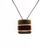 Fused glass Square pendant featuring a color block pattern with abstract Small Shapes on a clear glass background. Comes with satin cord with magnetic closure and matching glass ball stud earrings.