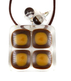 Fused glass pendant featuring a color block pattern with four opaque squares on a clear glass background. Comes with satin cord with magnetic closure and matching glass ball stud earrings.