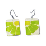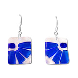 These earrings are made by using colorful pieces of glass arranged in a flower pattern against a Clear Sheet of Glass. It then goes to the oven at high temperatures so that the colorful and clear glass fuse together achieving this look.