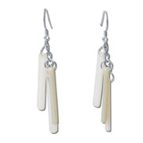 Made with Glass. Earring hooks are Sterling Silver, Chain is metal. Approximate measurements: Each Rectangular glass piece measures: 1 3/8" (3.5 cms) long by 1/8"(.4 cms) wide. Earrings total lenght (from top of hooks): 3" (7.5 cms).