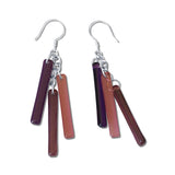 Glass Earrings that feature 3 long, thin, glass rectangles dangling from a Chain in 3 different shades of Magenta.