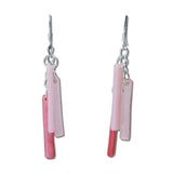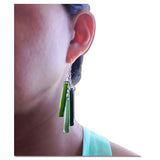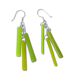 Glass Earrings that feature 3 long, thin, glass rectangles dangling from a Chain in 3 different shades of Green.