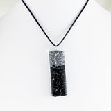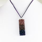 Rectangular clear pendant with colorful small triangles in three different shades. Comes with matching silk necklace with magnetic clasp and matching stud earrings.