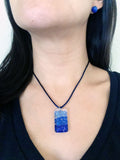 This Pendant is made by using colorful, triangle-like pieces of glass against a Clear Sheet of Glass. Then, they go into the oven at high temperatures so that the colorful and clear glass fuse together, achieving this look. It can be worn front or backwards. Either way, it looks beautiful. It also comes with a matching Dark Pink Silk Necklace with Magnetic Clasp and Matching Glass Ball Stud Earrings.