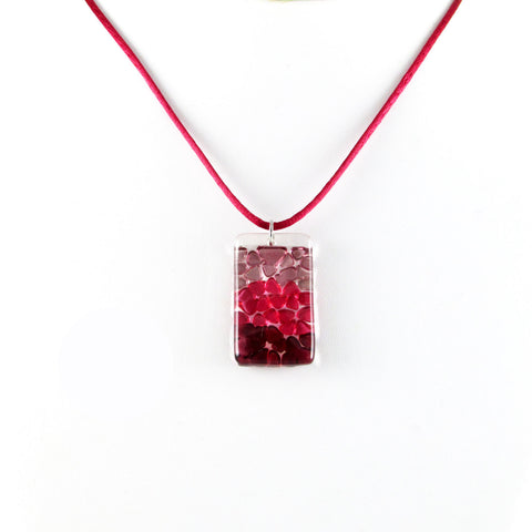 Rectangular Glass Pendant with Multiple, Small Triangular Cherry-Colored Fused Glass Pieces.