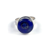 One of a Kind Ring with a Round Piece of Blown Glass. It's a great piece to give as a gift since it features an adjustable band, so no need to worry about sizes. Because of its Hand-made nature, every ring is Unique. The colors are the same as the ones in the pictures but the bubbles vary.