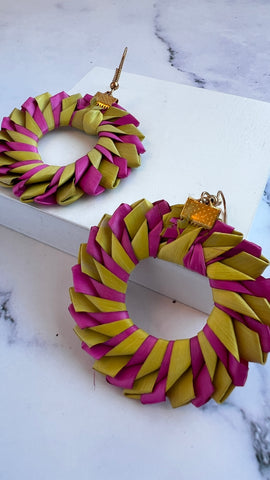 Elevate your accessory game with our Woven Palm Circle Earrings. Made of lightweight, naturally dyed in Yellow and Pink palm tree leaves woven into geometric circle. These one-of-a-kind earrings add a touch of exclusivity to any outfit. Embrace the exotic and unique with these must-have statement pieces.