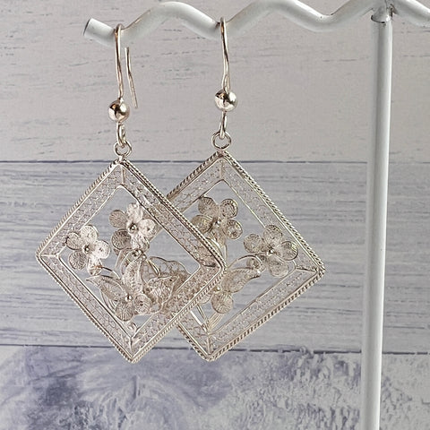 Indulge in the timeless elegance of our Filigree Floral Earrings. Crafted from luxurious sterling silver, these square earrings feature very intricate flowers and butterfly details. The craftsmanship is truly exceptional.